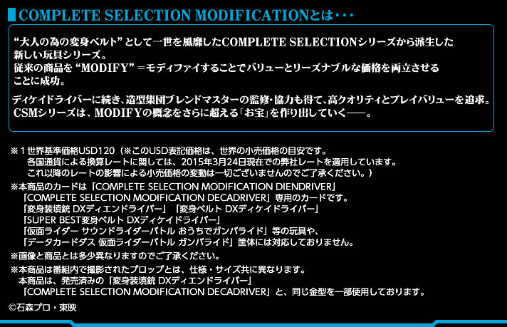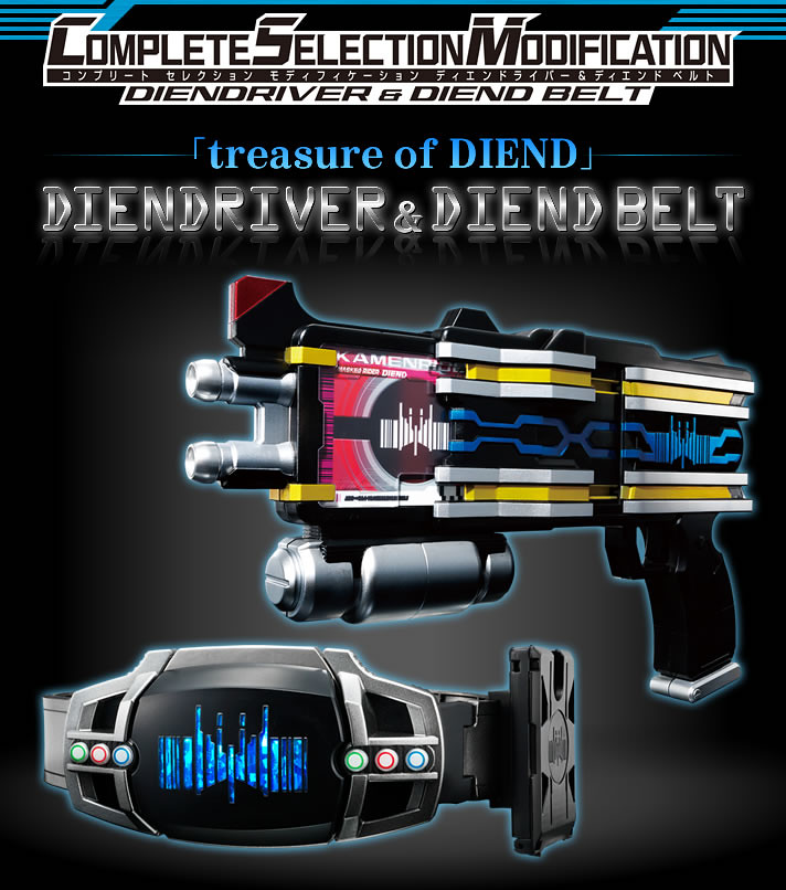 完全考究原作道具、徹底重現造型與設計,並搭配上高水準聲光效果的《假面騎士》終極收藏系列「COMPLETE SELECTION MODIFICATION」(簡寫為CSM),隆重推出第8彈,假面騎士DIEND的專屬道具「CSM DIENDRIVER & DIEND BELT」!