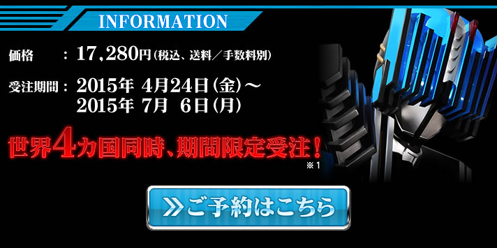 Premium Bandai 限定商品,即日起接受預約至2015年7月6日,參考售價新台幣4,200元,有興趣的玩具人可至以下網址購買:http://p-bandai.tw/bandaiasiawebshop/item-1100002700/