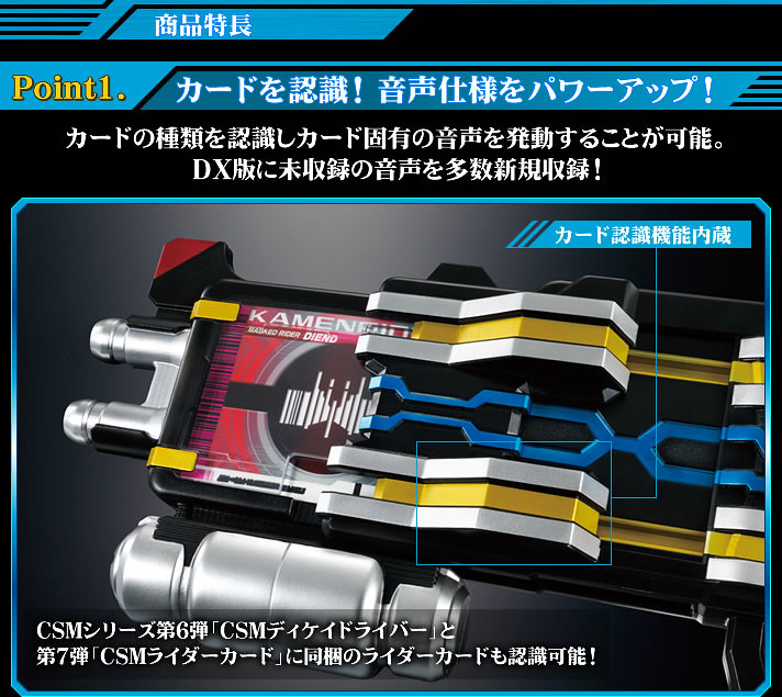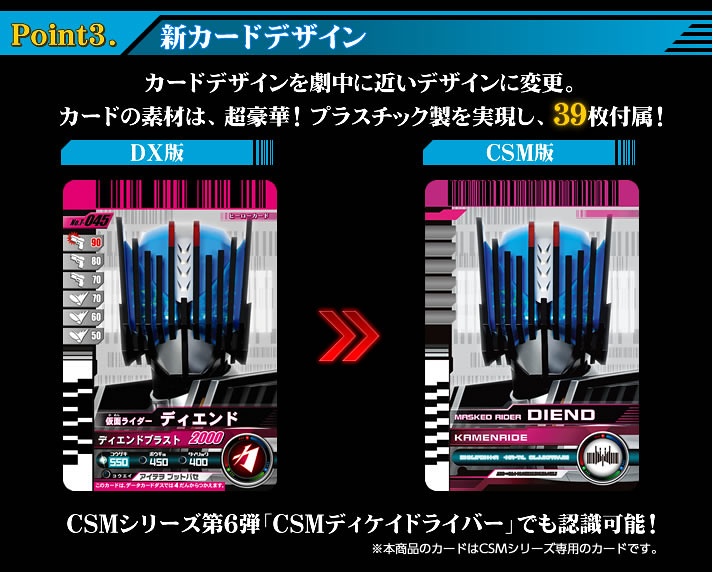 繼DECADRIVER 之後,這次CSM 最新的第8彈作品將《假面騎士Decade》的第二主角假面騎士DIEND 的道具「CSM DIENDRIVER & DIEND BELT」完全複製;槍型的DIENDRIVER 除了完整重現了造型之外,還內建有卡片辨識功能,並且可發出卡片的原有音效,以及大量DX版未收錄的全新音效。