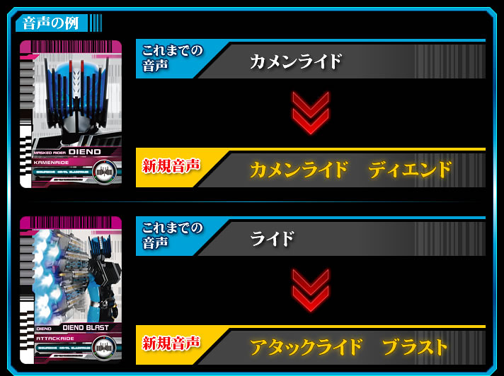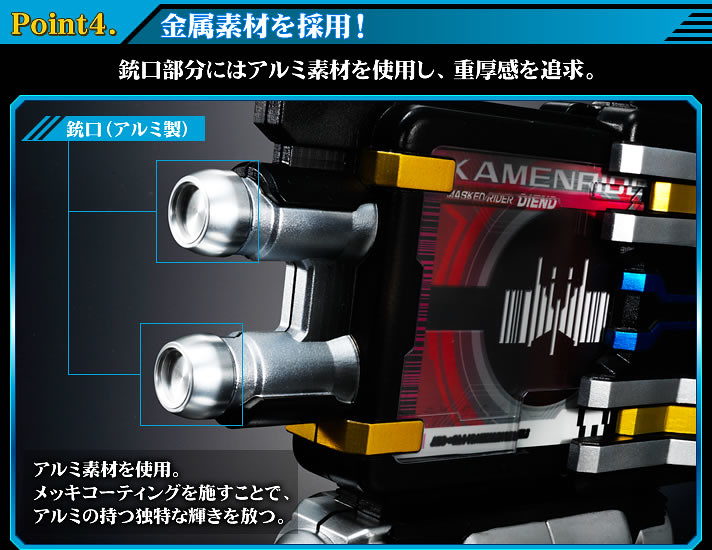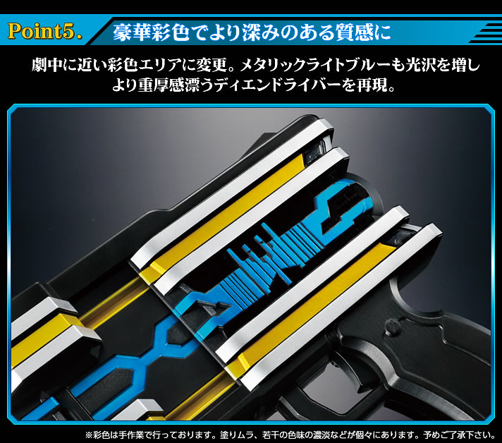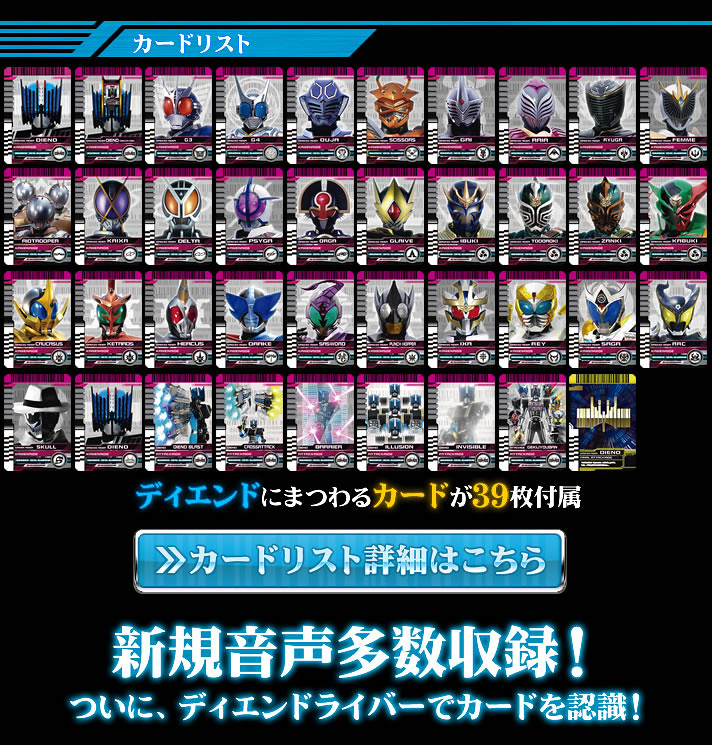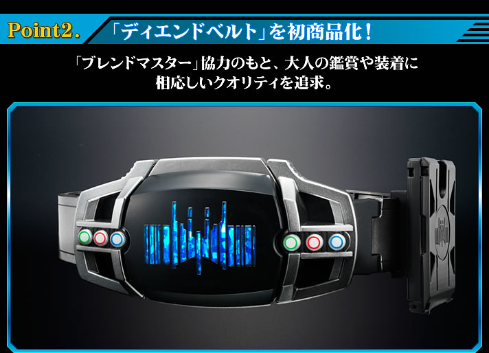 除此之外,腰帶「DIEND BELT」同樣是藉由2009年開始陸續為《假面騎士》劇組製作道具的ブレンドマスター(BLEND MASTER)協力製作,擁有100%道具還原等級的造型細節與上色;部分零件將使用金屬製作,更加增添穿戴時的重量感!除此之外,還將同步販售卡片收納冊,除了能夠收納39張卡片,還追加了一張升級的DIEND 卡片,以及卡片的解說書。豐富、齊全的豪華內容,堪稱最完美等級的終極收藏!