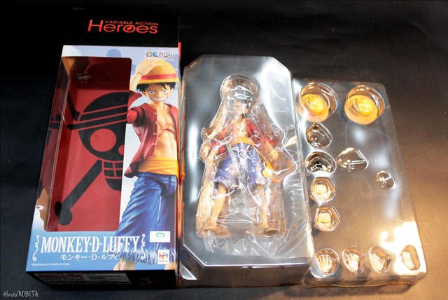 魯夫的方面,很標準的可動人偶包裝,下夾層為附屬配件,內盒有著草帽海賊團的大圖,用上的是很適合魯夫的大紅色。
