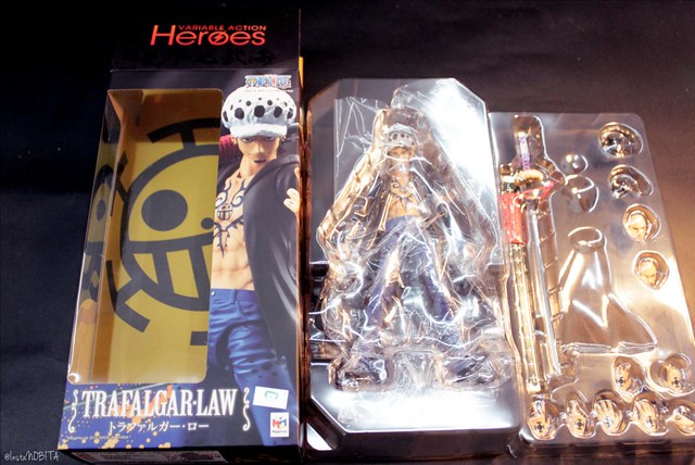 接下來是羅的部份,一樣也是分為雙層式包裝,內盒部份當然就是紅心海賊團的標誌了,配色為黃色,比較特別的部份是上蓋還壓印了個「王下七武海」的字樣。p.s. 魯夫為懸賞金額4億貝里。