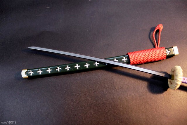 羅的配刀「鬼哭」,類似真刀的金屬處理非常好,增加了真實度,沒有想像中的堅硬刺人,想必有考量安全上的問題,但當然各位小朋友還是別拿來亂插好……