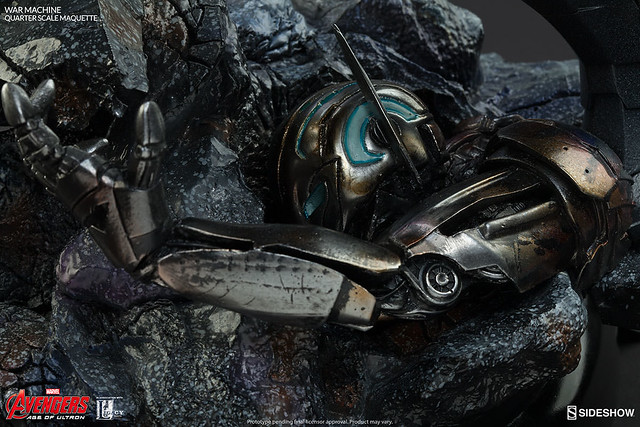 Sideshow Collectibles 公司這次將要在旗下Quarter Scale Maquette 系列推出的復仇者聯盟2:奧創紀元的「戰爭機器」作品是採用兼具觀賞最佳尺寸與魄力的1/4 比例,黑色搭配的銀灰色的盔甲也以超細膩的金屬質感方式呈現,在雙眼、胸口反應爐都配備LED 發光機制。最特別的是這次的地台是採用被摧毀的奧創馬克1 作為搭配,實在是太帥氣啦!
