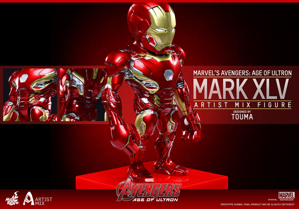 這次,知名設計師TOUMA 又將與Hot Toys 公司推出第二彈「復仇者聯盟2:奧創紀元」的聯名作品,一口氣推出了五個款式外加一個組合包:「馬克45」(Mark XLV;AMC009)、「索爾」(Thor;AMC010)、「幻視」(Vision;AMC011)、「鋼鐵大軍」(Iron Legion;AMC012)、「一般版浩克」(Hulk;AMC012)。另外,還有一款組合包,內容包括了前四款作品,並加送一款「組合包版浩克」(Hulk;AMC013)。