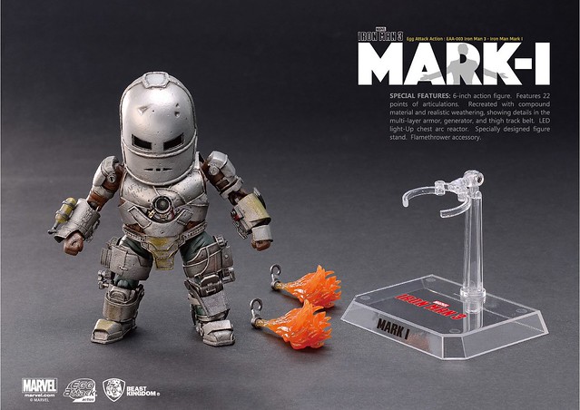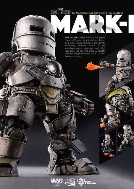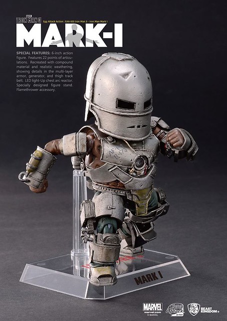 由野獸國玩具公司所推出最新的Egg Attack Action 系列可動公仔作品,是電影「鋼鐵人」中的「馬克1」作品。這次推出的鋼鐵人裝甲是重現東尼.史塔克被俘虜之後,在山洞中利用有限資源所打造出的鋼鐵裝甲「馬克1」(Iron Man Mark I)。全身多達22 處可動關節,配合替換2 個火焰特效配件。實在是太讚了啊!