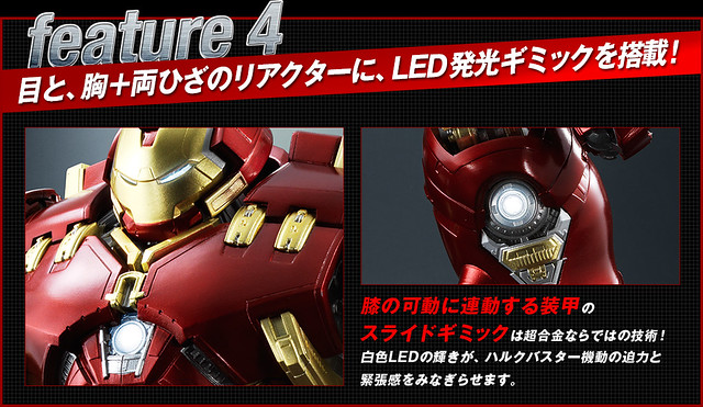 除此之外,取自「超合金」系列的特殊設計,讓膝蓋關節擁有更好的可動性與穩定性,並且製作了全手指可動的手掌,能夠重現與浩克力量對決的震撼場面;除此之外,部分採用合金製作,加強把玩時重量裝甲的厚重感,以及下盤穩定性。最後,在雙眼、胸口以及兩個膝蓋皆具備了發光功能,完整呈現原作的模樣!