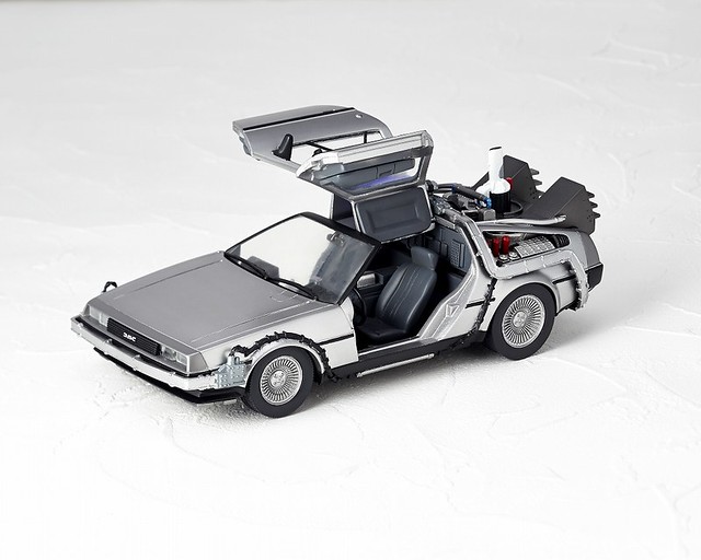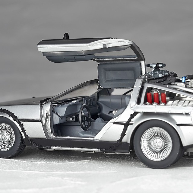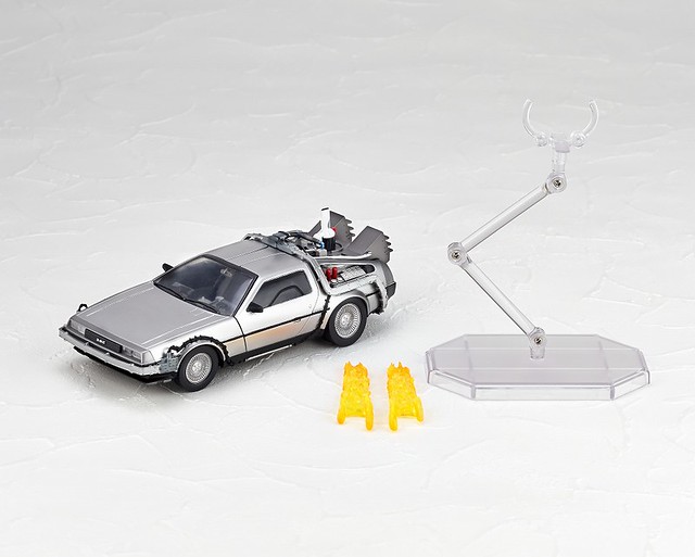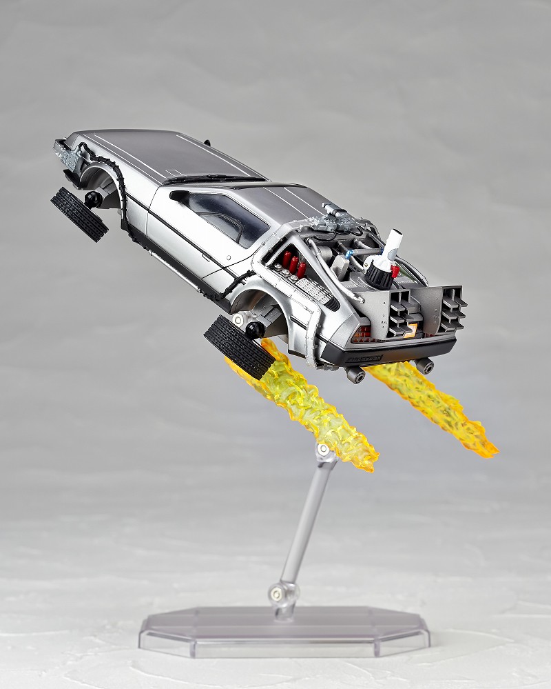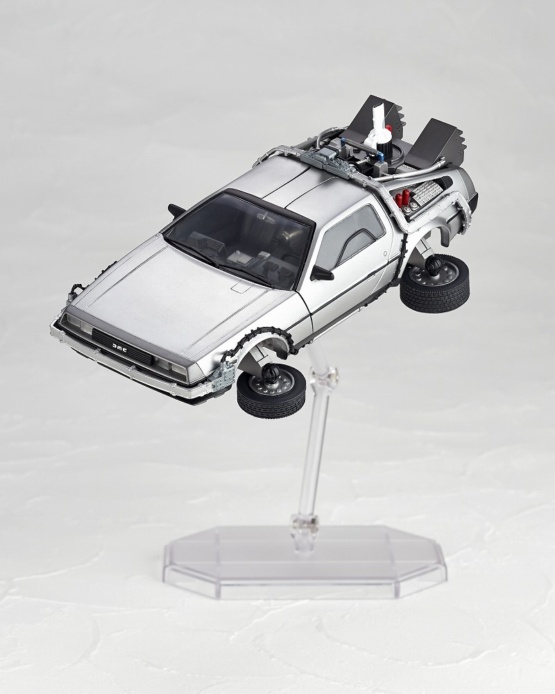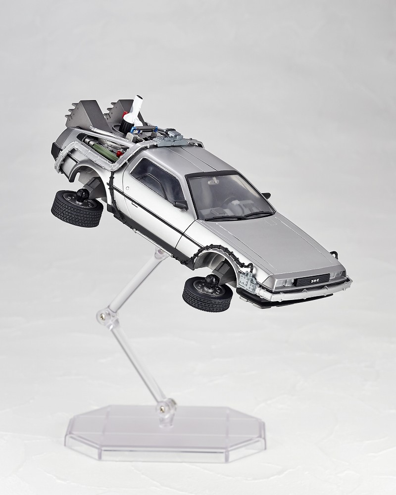 首款值得紀念的作品,推出了《回到未來》時光車的《FIGURE COMPLEX MOVIE REVO》系列,將投入輪轉科技系列(Revoltech)所培育的技術,把電影中所登場的機械、載具玩偶化!這次推出的作品,是以《回到未來2》中所登場的時光車來製作,特殊的車門開閉、車內的細部構造完全再現!並將附屬了特製的展示架,搭配上輪胎可左右拉出旋轉的設計,能夠呈現出原作中的飛行畫面!
