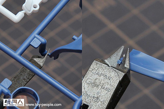 ▼ 零件的剪裁,採用兩段式剪裁法,先從零件連接處的頂端剪裁;剪下後,再做第二次的修剪。