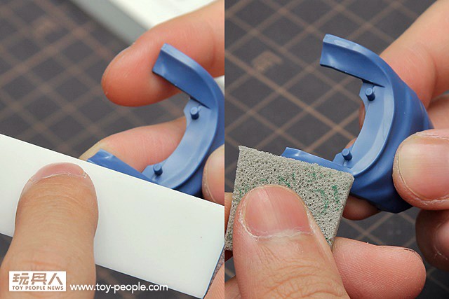 ▼ 像這種面積有點大的湯口,我們可以拿研磨版,先把留下的湯口塑料研磨掉;磨掉之後,再使用號數大但研磨顆粒小的研磨海綿(等同研磨砂紙800號~1000號)做修飾。
