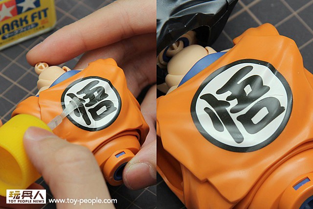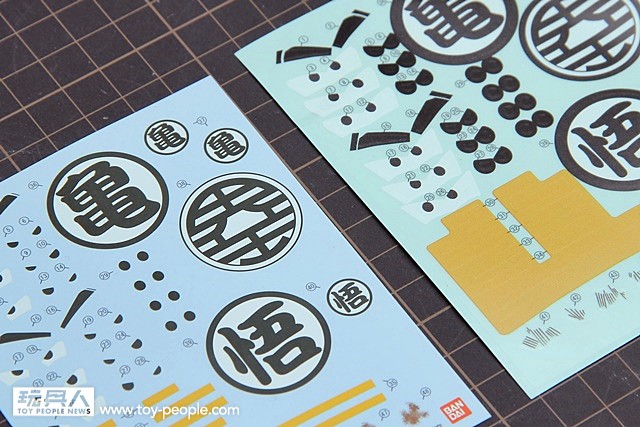 ▼ 再開始增加陰影前,我們需要先把悟空身上的細節貼上。這組套件裡面,就附贈了兩款規格的貼紙,第一種是透明貼;第二種是水轉印貼紙。在貼紙上,分別有悟空學習三階段的修行服字樣;分別是跟龜仙人武天老師學習時期的龜字樣;跟界王學習時期的界王字樣以及悟空自成一家的悟字樣。此外也有動畫效果的表面款式像是臉部擦傷跟衣服的破損。