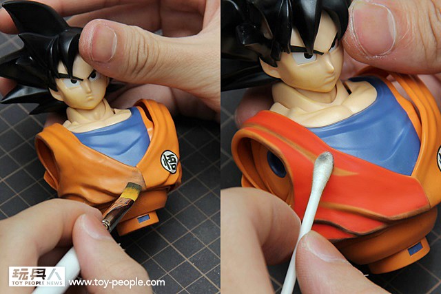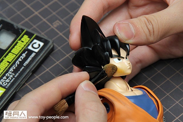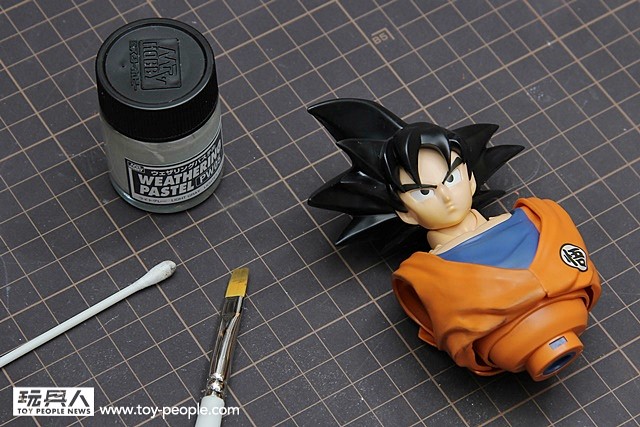 ▼ 在臉頰或是悟空的手臂的陰影處,用舊化粉彩幫他上一點土黃色系的粉彩。一方面可以讓悟空的膚色不會只有塑膠成色,看起來會有變化,另一方面,也可以在這時候風沙打過的痕跡,畢竟悟空的戰鬥經常是毀天滅地那種等級的。