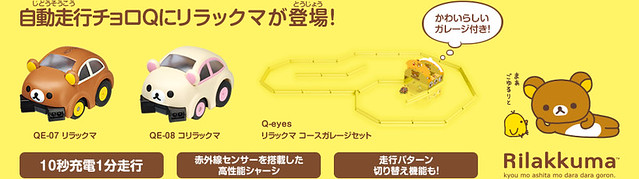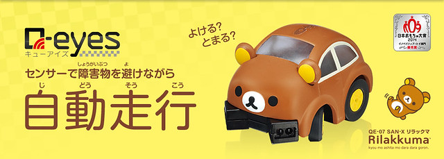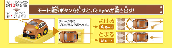 「Q-eyes」首款以拉拉熊車為主題,同時推出拉拉熊和妹妹兩款車輛種類,有興趣的玩具人可以參考下面官方的展示宣傳短片,「Q-eyes」的拉拉熊車可以自己避開障礙物向前行走的模樣相當有趣,另外還有販售其系列的拉拉熊車輛專用的車庫售價約5,500円日幣,提供給喜歡《拉拉熊》的玩具人參考。
