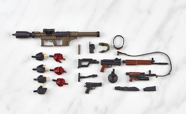 除此之外,迷你輪轉可動《潛龍諜影:幻痛》系列作品的另一大特色在於將槍枝模組化,拆分為許多零件,能夠藉由與上一個版本交換不同的附屬零件,組合出更多樣式。從圖片中可以看出,這次配備的槍枝,槍管加裝了手電筒,並附有衝鋒槍背帶、彈匣更換為彈鼓,以及附有兩種金屬製的輕量化槍托。