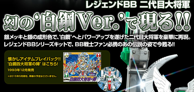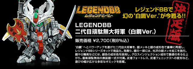 以電鍍質感加上特殊成形色,來呈現BB戰士獨特的華麗、耀眼鎧甲造型的高級收藏系列『BB戰士傳奇』(LEGEND BB),除了將再度販售闇軍團的首領「闇將軍」殺驅頭超鋼版之外,最新作將推出率領「武者七人眾」與闇皇帝對抗的“頑駄無大將軍”!