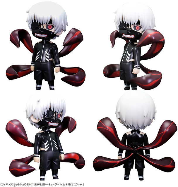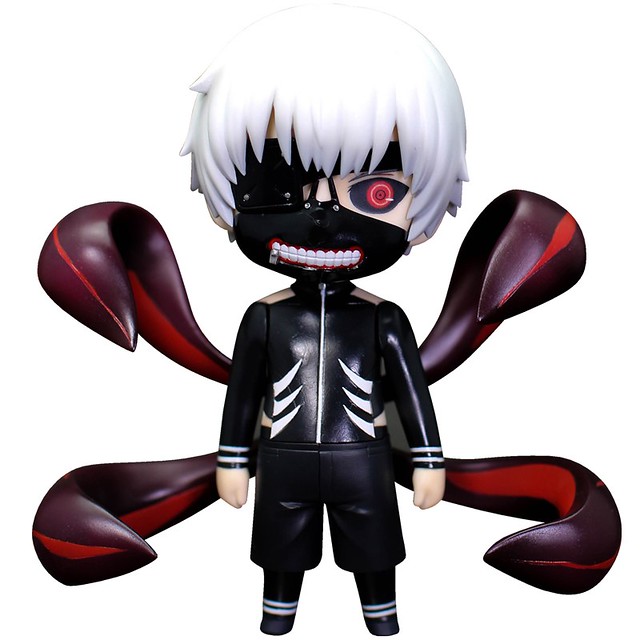 以恐怖漫畫《東京喰種》當中主要角色金木研覺醒後有紅色的赫眼和身背長出赫子的模樣呈現,有別於其他玩具廠商推出的「金木研 覺醒版本」正常比例的版本,這次以略微Q版本頭部放大像是黏土人玩具商品的尺寸比例來製作,另外再HMV店限定販售的版本是戴著眼帯和口罩的模樣,提供給喜歡《東京喰種》的玩具人參考。