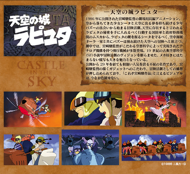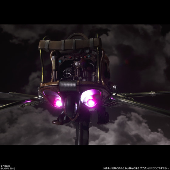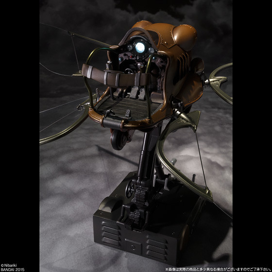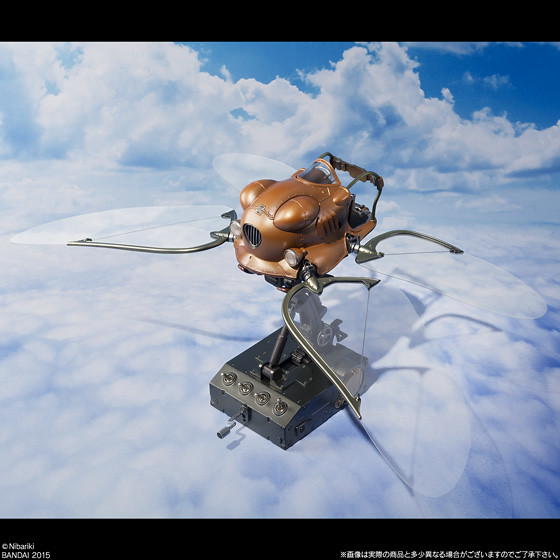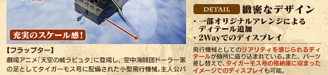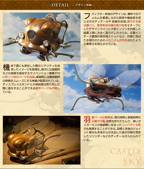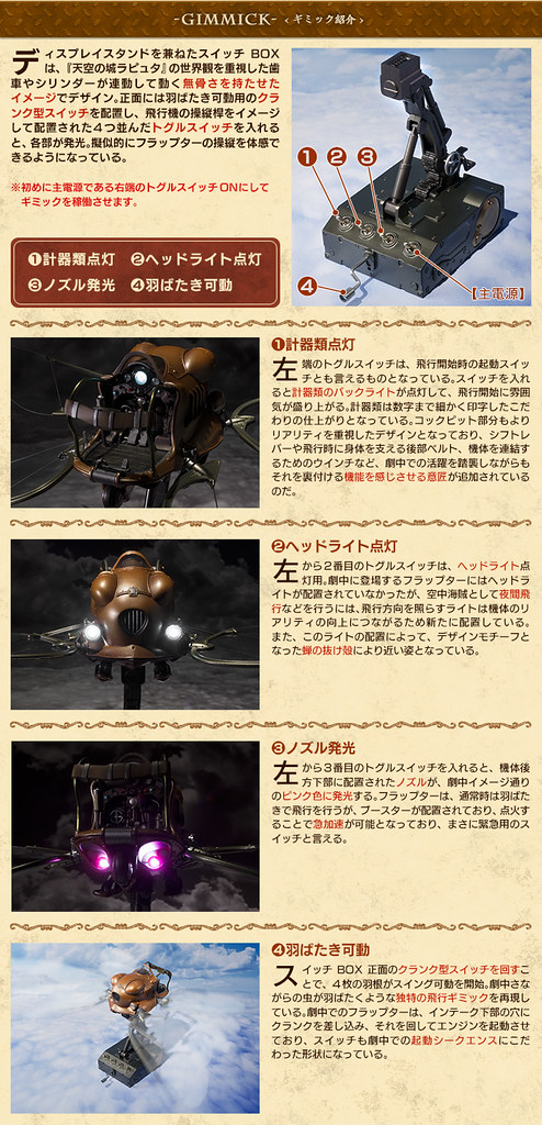 這次作品的最大特色,在於重現了四隻翅膀交互拍打的動態,將原作中宛如昆蟲的獨特飛行方式完全重現。除此之外,儀表板、頭燈與尾燈具備了發光機能,並且使用了以鼓翼機操縱席儀表板的造型,設計出了兼具支架與操控的特殊底座,令人彷彿置身於《天空之城》世界中,原作氣息滿點的誠意之作!
