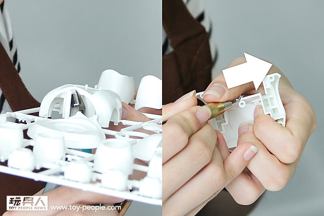 ▼ 開始正式挑戰!先依照說明書,找到你需要的零件,從下往上留一點點隙縫就可以把零件剪下來。然後換上筆刀,使用右手持刀,左手拇指輕推把多餘的部分削掉。這樣缺口才會平整,漂亮。