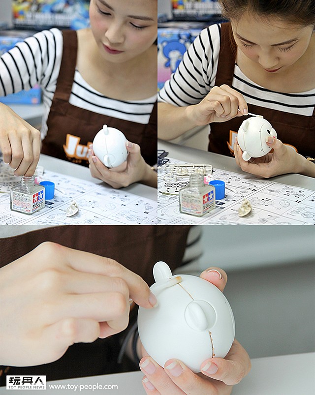 ▼ 柯柯挑戰墨線時間! 搖勻墨線液之後,輕點在模型的細微刻痕上,墨線就會稍稍的自己流動。