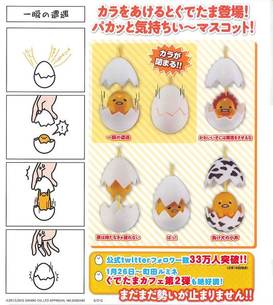 繼日前推出過的「蛋黃哥不倒翁」轉蛋作品之後,TAKARA TOMY 公司將於2015 年06 月推出最新人氣角色「蛋黃哥」轉蛋企畫「破裂一瞬間」的超療癒作品。這次所推出的五款作品都看起來超妙的,搭配著蛋黃哥懶懶笨笨的風格,讓整體作品的造型感大大提升了不少。