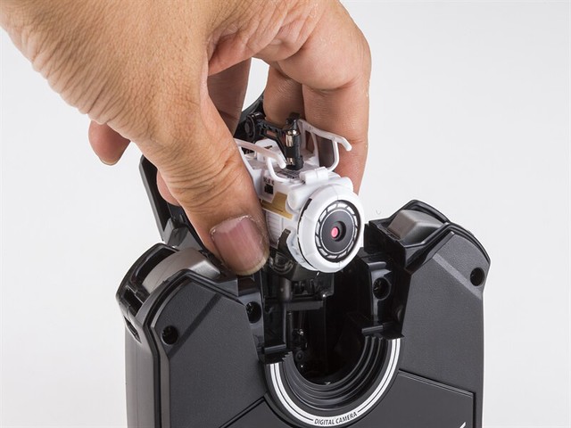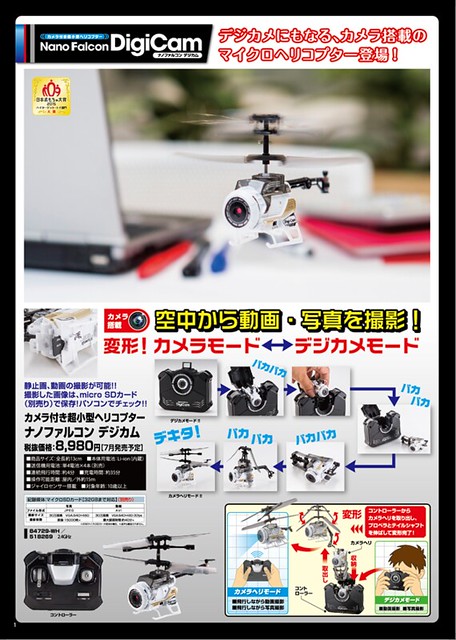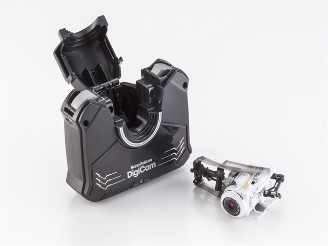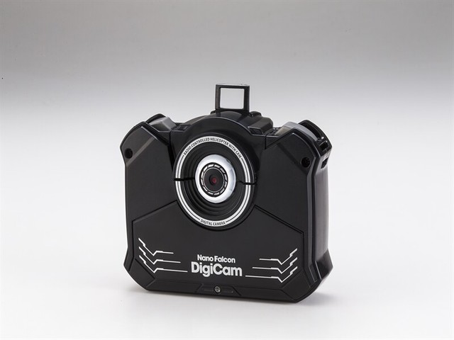 這次的新機種名為「NANO FALCON DiGiCam」,在機身前端置入了攝像鏡頭,擁有能夠飛行時遙控拍照或攝影的機能,並藉由microSD 記憶卡存取至電腦播放。除此之外,「NANO FALCON DiGiCam」因應其機能,設計了螺旋槳能夠折疊的機構,能夠將機身收藏於遙控器中,方便攜帶又可同步藉由控制器充電。