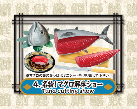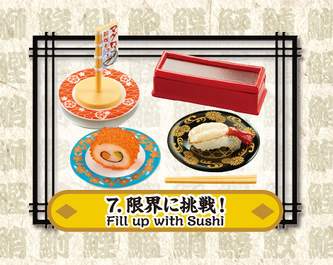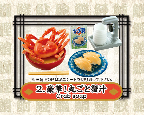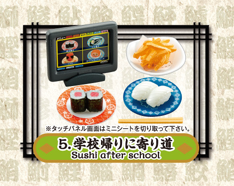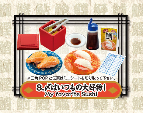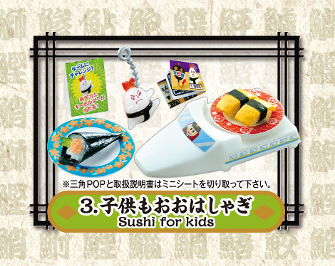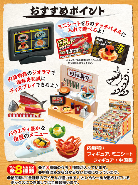 這個最新以迴轉壽司屋為主題的「小小迴轉壽司屋」食玩作品!全部共有八個款式可以選擇,全部都是在迴轉壽司屋出現的可口美食相關的造型。這八個主題包括:1、女子に人気;2、豪華!丸ごと蟹汁;3、子供おおはしゃぎ;4、名物!マグロ解体ショー;5、学校帰りに寄り道;6、今日は給料日!;7、限界に挑戦!;以及8、〆はいつもの大好物!。