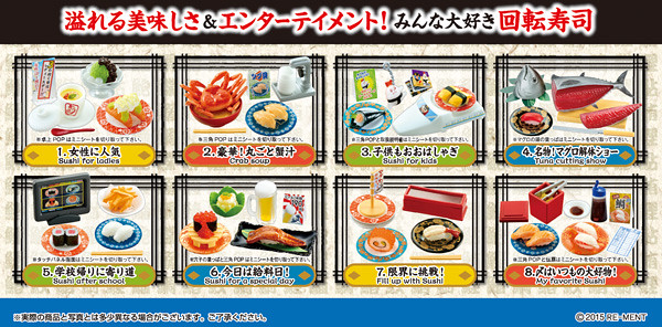 最近日本各家轉蛋品牌都紛紛推出以有趣壽司主題的相關商品,而日本知名食玩品牌RE-MENT 公司日前也推出一系列看起來超級可口又高級的「THE 握壽司」轉蛋作品。而這次,RE-MENT 公司預定將在2015 年07 月13 日推出最新的「小小迴轉壽司屋」(ぷち回転寿司)食玩作品。