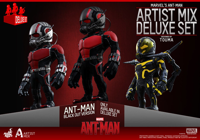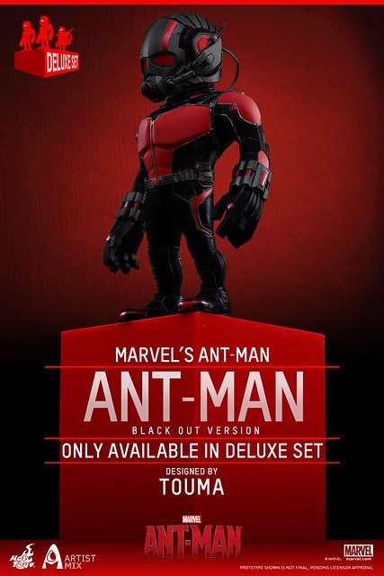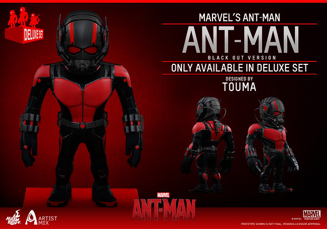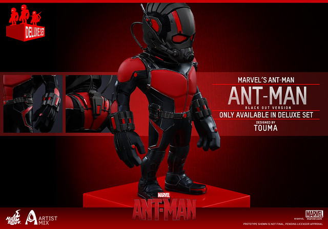 這次,知名設計師TOUMA 與Hot Toys 公司推出聯名系列第三彈的「蟻人」作品,推出了兩個款式:「蟻人」(Ant-Man;AMC014)、「黃蜂人」(Yellowjacket;AMC015)。另外,還有一款豪華組合包的版本,內容包括了前二款作品,並多付上一款「黑色版本蟻人」(Black Out Version)。