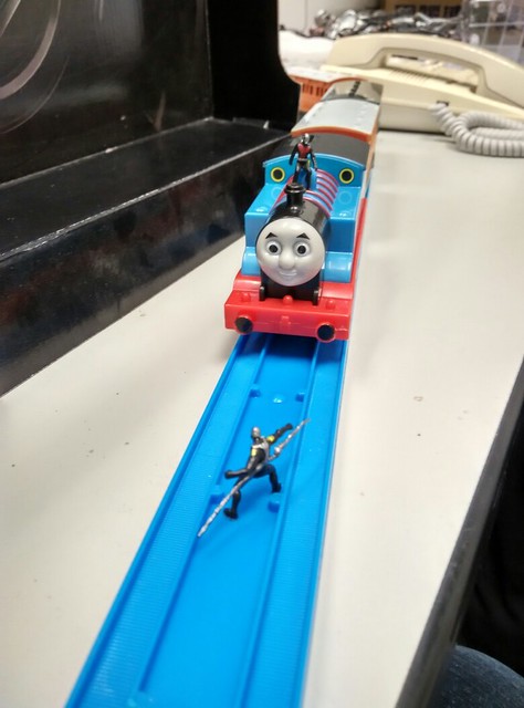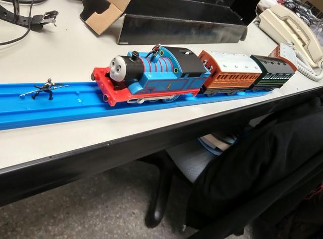 在一開始看到ML會附這小人的時後我就下定決心要擺出這場景了!!相信要是看過預告片的人一定對邪惡的湯瑪士小火車印象深刻吧!那湯瑪士要找跟電影中同款的還真不好找!綠色那節我找了好久只找到一台...