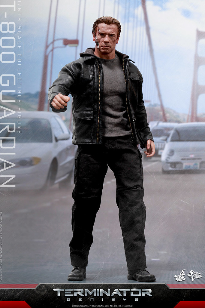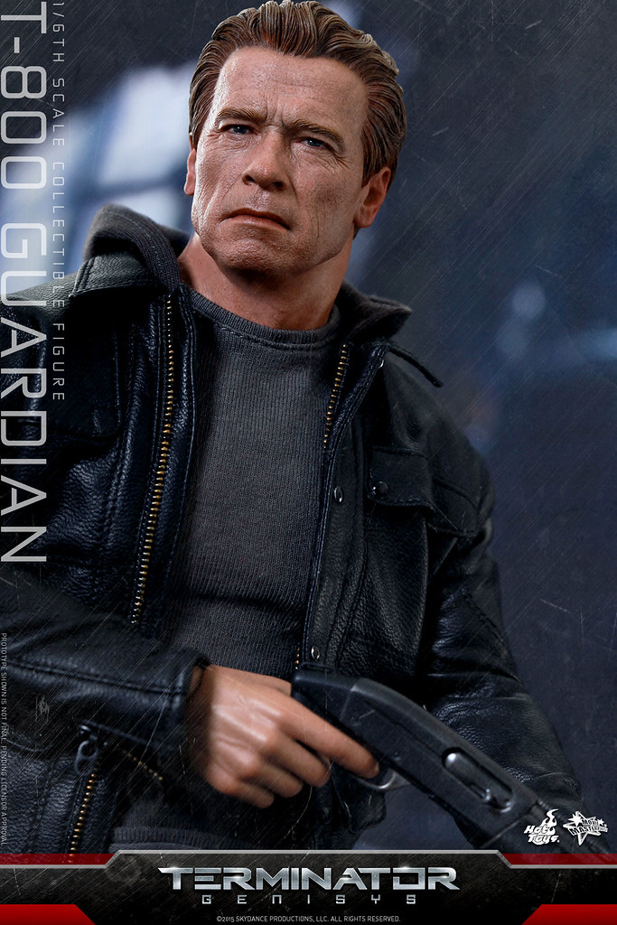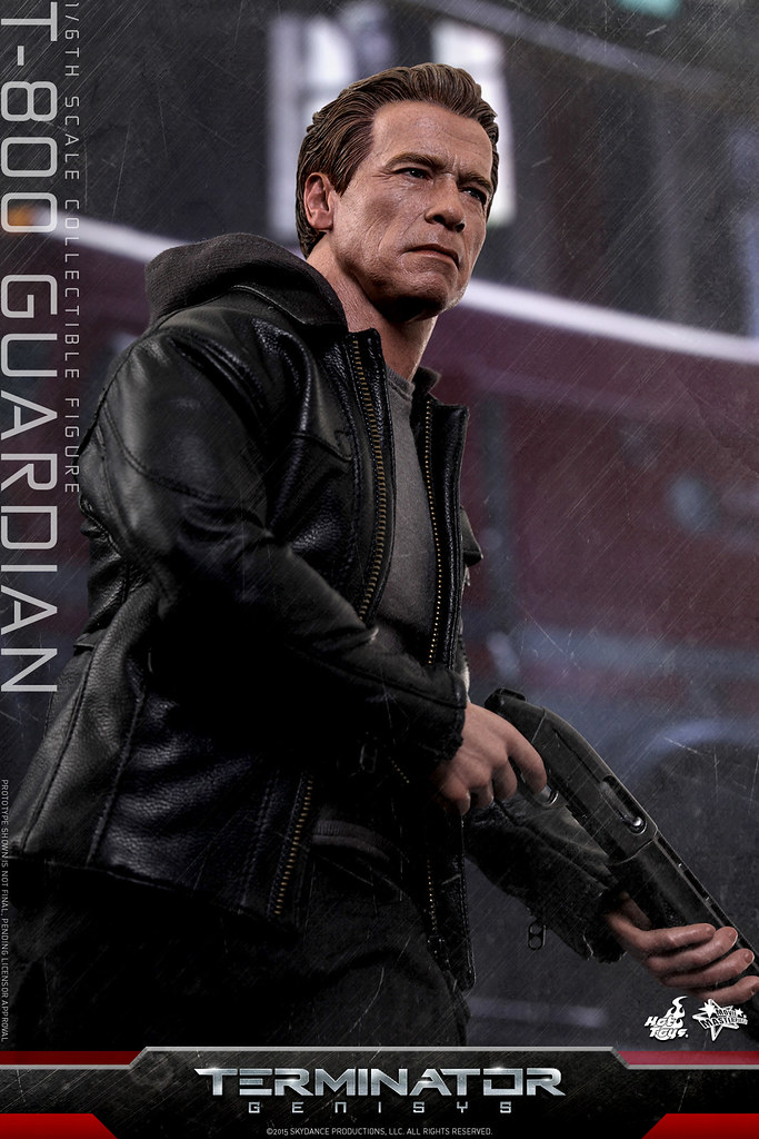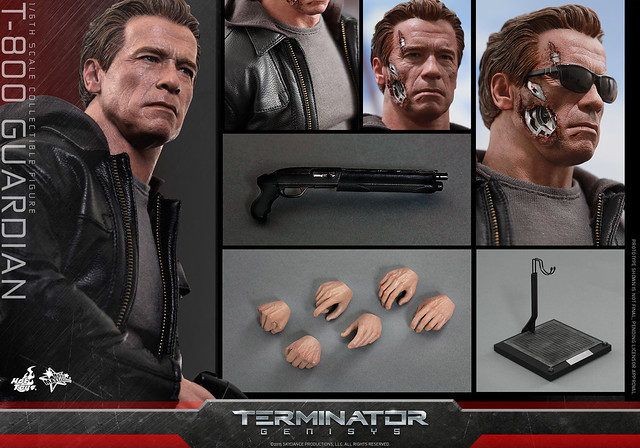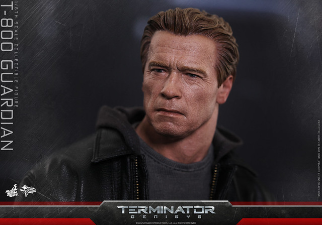 這次回歸再度演出的阿諾‧史瓦辛格,是一款在莎拉9 歲時,領養當時成為孤兒的她、設計成守衛而不是殺戮的終結者;這次Hot Toys 所推出的這款作品,附有普通與戰損兩種不同的頭雕,以及英國經典騎士皮衣品牌“Matchless”所授權的1/6 皮衣服飾,一把削成短槍管的雷明登1100半自動霰彈槍以及內建LED 發光效果的地台。