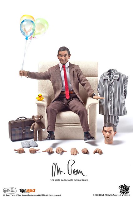 這次ZCWO 公司所推出的1/6 比例「豆豆先生」作品,其附上了兩顆羅溫.艾金森飾演豆豆先生經典表情的頭雕,包括了一顆微笑表情頭雕與一顆驚訝表情頭雕。這次除了標準豆豆先生的西裝、泰迪熊、手提皮箱等配件之外,還附上了經典的睡衣、沙發、黃色小鴨以及氣球的配件。而豪華版還多附上了一個素體讓各位玩具人可以組兩支「豆豆先生」。
