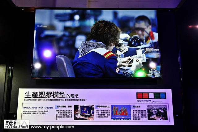 ▼ 上方的螢幕播放影片,介紹一款鋼彈從發想開始,直到量產發行的所有經歷流程。