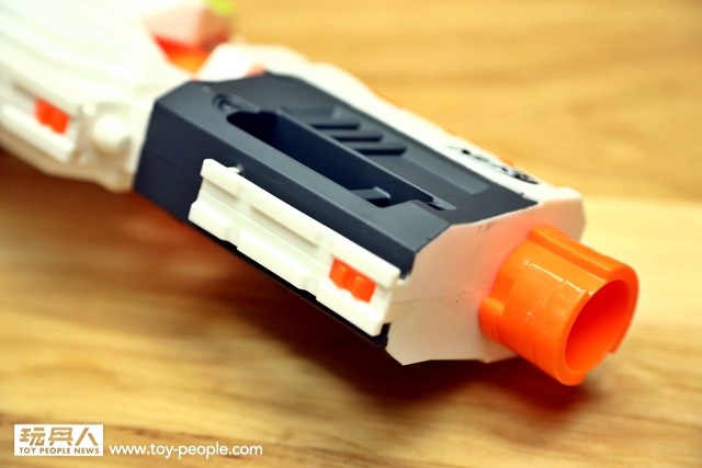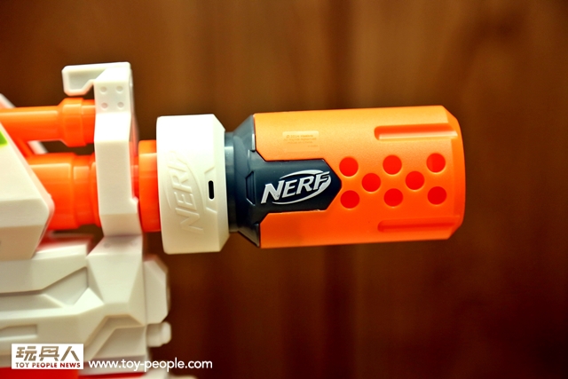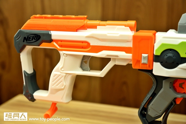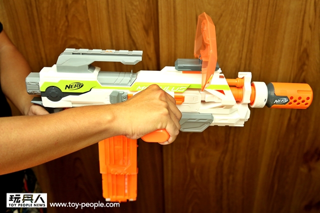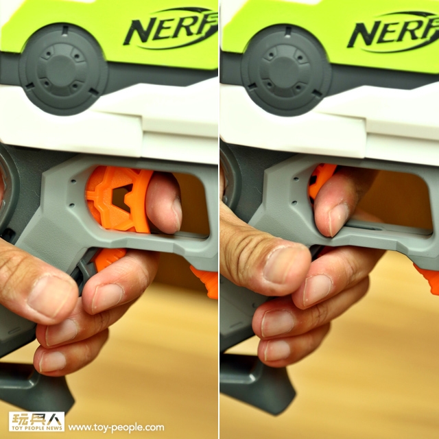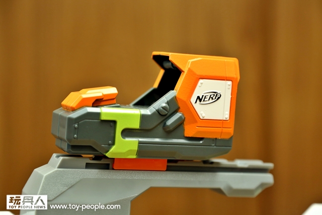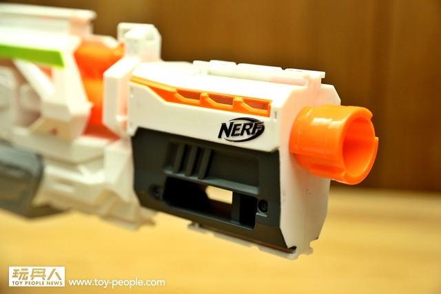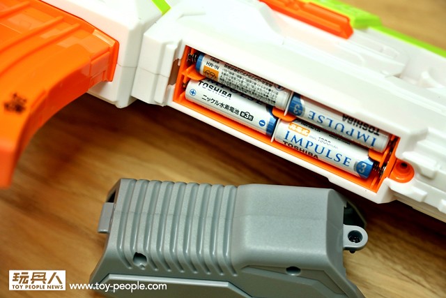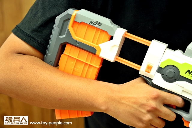 ▼ NERF 分為彈簧裝置與電動射擊兩種方式。這一把ECS射擊槍使用的是電動射擊,所以不需要手動上緊機關,能夠輕鬆地連續發射。不過,上場前如果沒檢查好電量,沒電就GG嘍~ QAQ