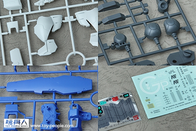 此外成型色的色澤也相當的漂亮,若是直接用成型色製作的方式,GP04G的效果就相當不錯了。而貼紙的數量,其實很少,這代表了模型套件分色的很成功。除了作為眼睛、瞄準跟定位的螢光綠貼紙之外,就只有推進器的散熱細節需要貼紙。而透明撕貼的數量也很充足,讓你可以把機體的細節都充分的表現。