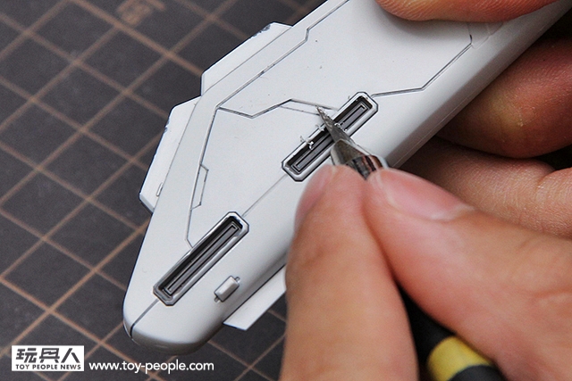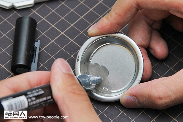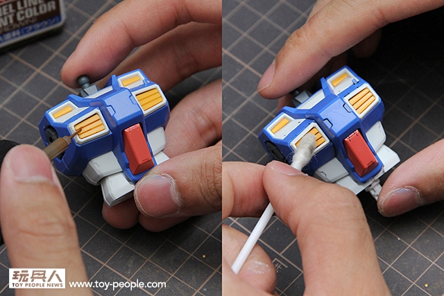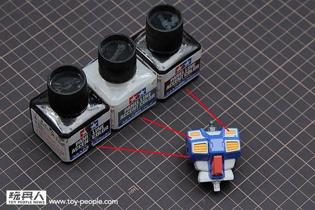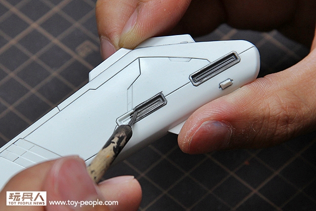 ▼ 直接使用墨線液中的毛刷入墨,點完後等待約5~10分鐘。再使用沾取田宮X20溶劑的棉花棒或是墨線擦拭筆把多餘的墨線液擦拭掉即可。