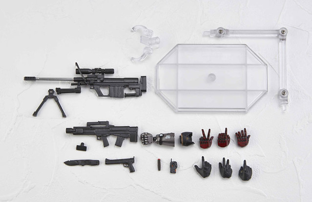 配件的部分,則是收錄了特殊的「火箭飛拳」義肢、手槍、匕首、iDROID以及幻影雪茄,豐富多樣的配件能夠呈現遊戲中的多種精彩場面。除此之外,武器則是配備了狙擊槍與衝鋒槍,並且能夠裝備於背部,做出背槍的造型。不論是全副武裝的正面攻擊,或是輕裝的匿蹤潛入都能夠精彩呈現。 最後,還配備了母基地補給用的裝備箱的紙模型。