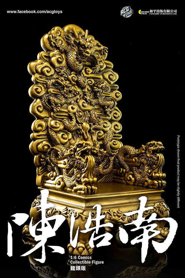 有別於普通街頭小混混造型的陳浩南,這次的新作採用了陳浩南成為“龍頭”之後的造型作為設計,全新設計的頭雕比過去更加地霸氣逼人,除此之外神情也更加沈穩、冷酷;搭配其地位,龍頭版陳浩南身穿合身筆挺、英氣逼人的合身西裝以及大衣;而本組合的最大亮點,就是精心設計、以大量精緻細節堆砌而出的龍頭椅,一共有奢華金色與低調沈穩的黑鐵舊化兩種選擇。