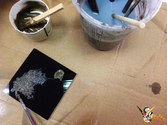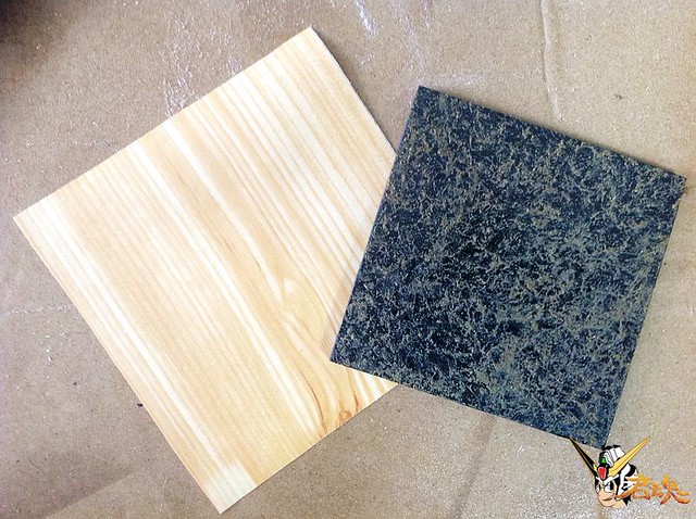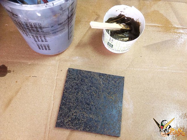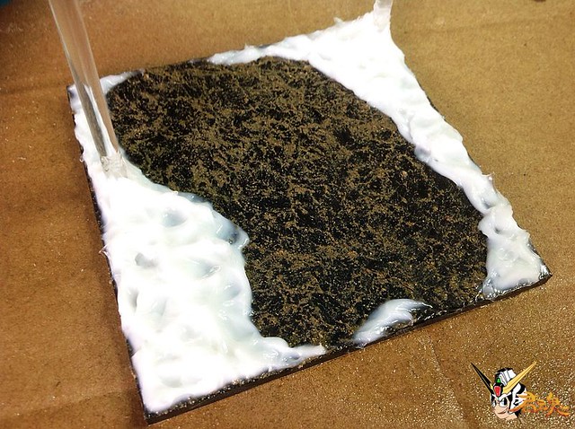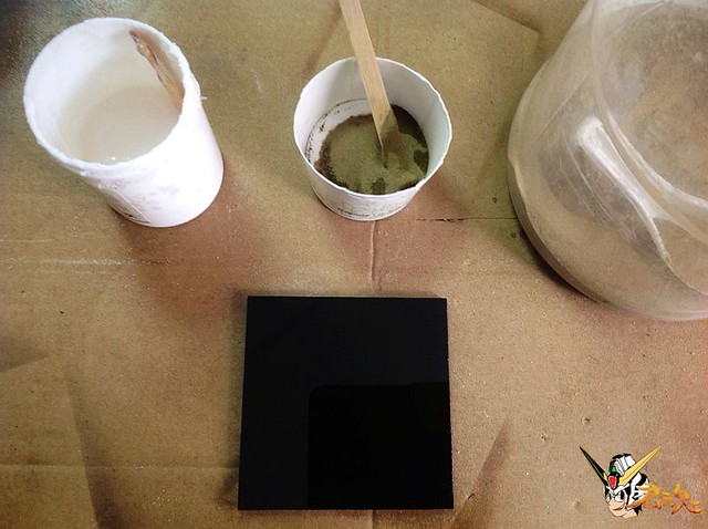 1、首先找一塊壓克力板或木板,再來表面處理,模擬跟附贈地台一樣的地質。可到工地或大自然找一些真的沙子並去除雜質,把沙子跟美術用凝膠混合攪拌,均勻的鋪在底板上,等待乾燥硬化。