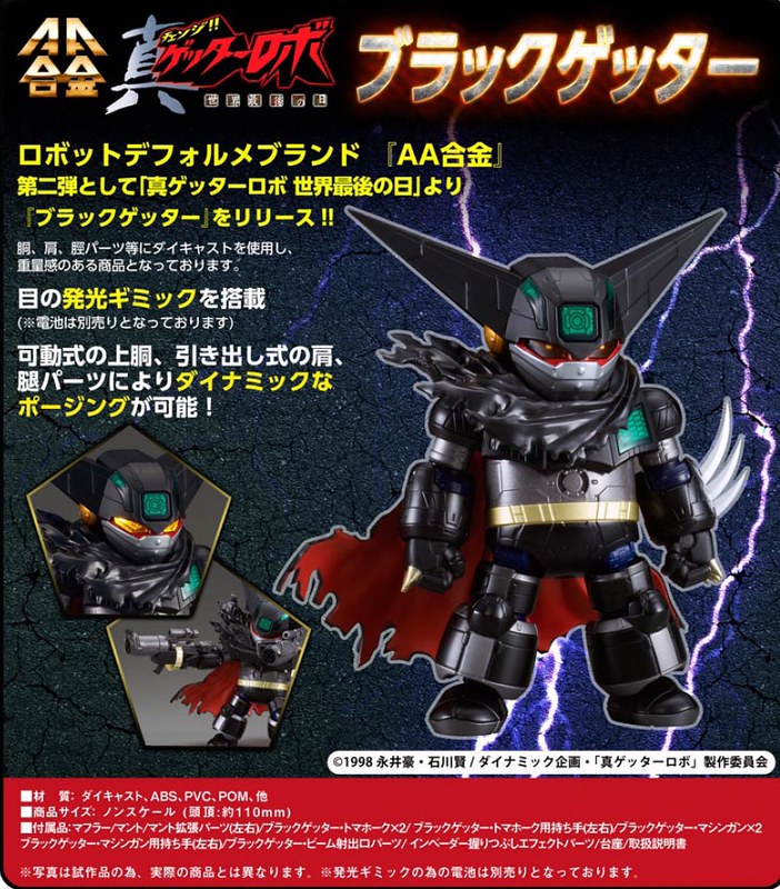 日本ARCADIA 玩具,獲得粉絲大好評的Q版合金機器人系列『AA合金』,延續第一彈的蓋特1號,第二彈將發行出自《真蓋特機器人 世界最後之日》(真ゲッターロボ 世界最後の日)的帥氣機體“黑蓋特”(ブラックゲッター)!