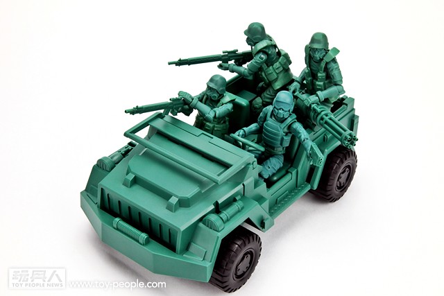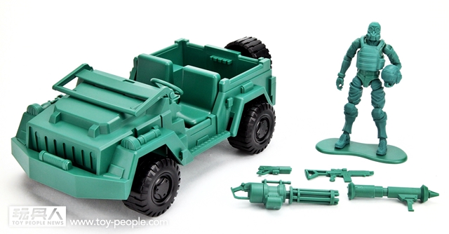 ▼ 內容物一覽,內容包含了一款復古設計、1/18比例的綠色吉普車、一隻綠色指揮官,以及四把不同火力與用途的武器。