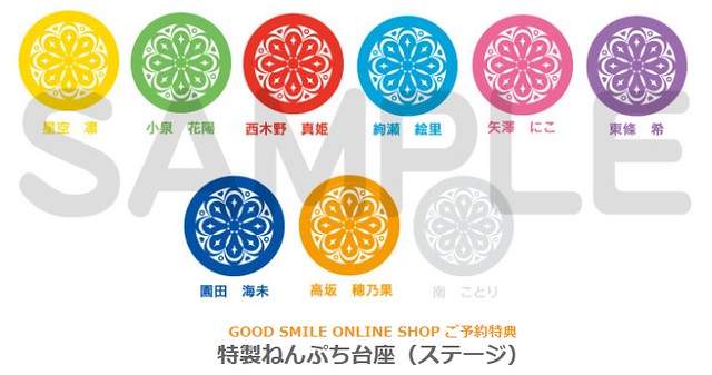 一口氣收錄了「高坂穂乃果」、「園田海未」、「南ことり」、「小泉花陽」、「星空凛」、「西木野真姫」、「矢澤にこ」、「絢瀬絵里」和「東條希」等等9位角色人物+一個隱藏版本的人物,每個人物都穿著特製造型的服裝,在GOOD SMILE ONLINE SHOP線上商店預購這套商品附有「特製ねんぷち台座(ステージ)」特製的底座配件,提供給喜歡《LoveLive!》系列的玩具人參考。