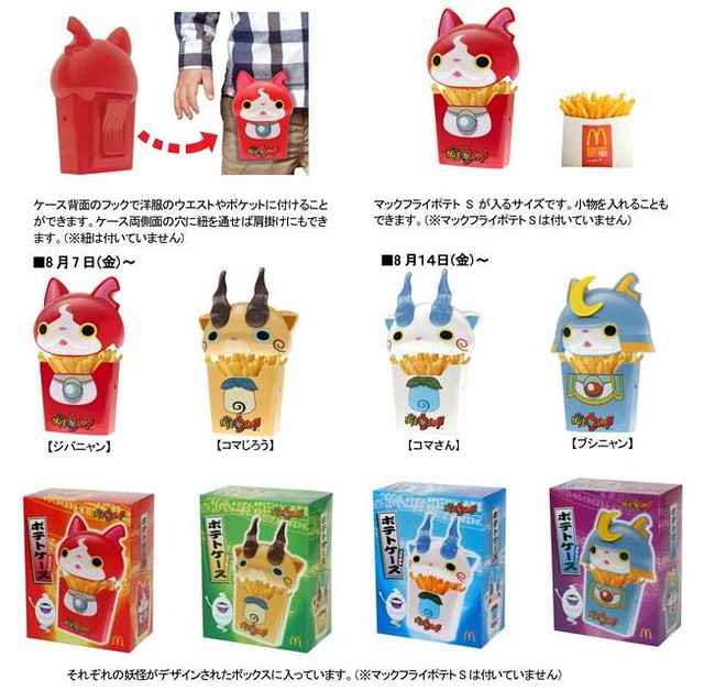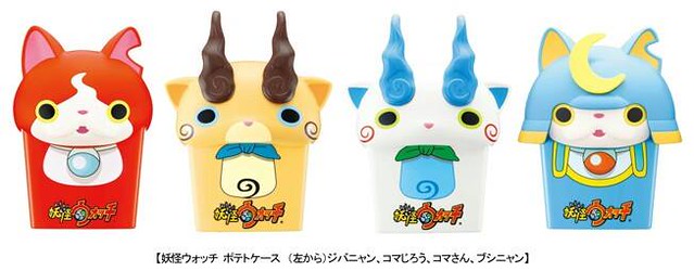 家中如果有小孩子的玩具人應該都知道,最近超人氣動畫《妖怪手錶》的熱潮持續延燒,現在日麥當勞預計在8月推出妖怪ウォッチ ポテトケース,有趣的妖怪手錶主題的薯條盒(收納盒)暫時翻譯,妖怪手錶故事內容描述主人公景太意外啟動了妖怪轉蛋機,喚出了妖怪執事威斯帕,從此開始了與各種妖怪相逢的奇幻故事。