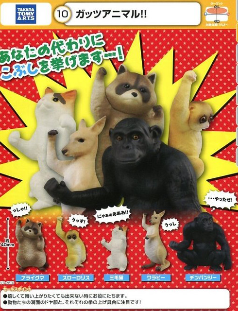日Takara Tomy玩具公司旗下有趣轉蛋商品T-ARTS品牌繼推出會「壁咚」的動物們後乘勝追擊,這一次將再推出「 ガッツ アニマル!」勝利姿勢的動物們(名稱暫譯),又將動物擬人化作出當勝利或是成功時候會握拳向上伸的模樣呈現。