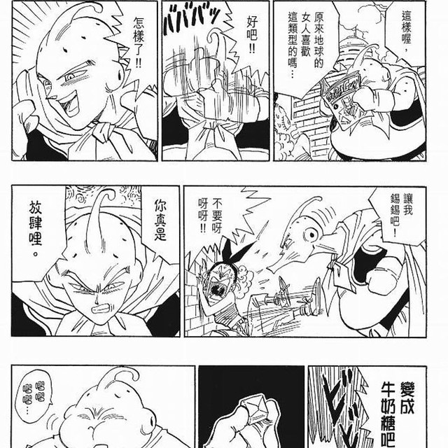 ▼ 漫畫當中魔人普烏 變成帥哥(變成名模バリー・カーン)時的橋段。