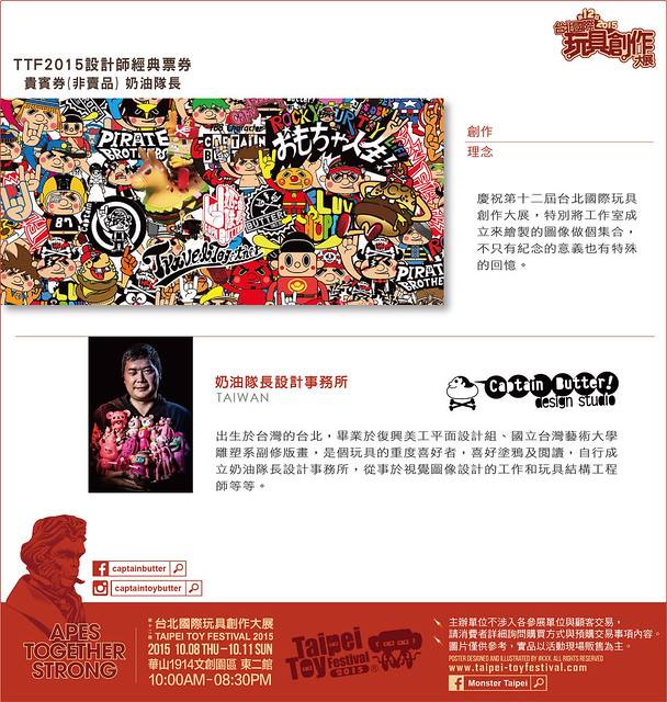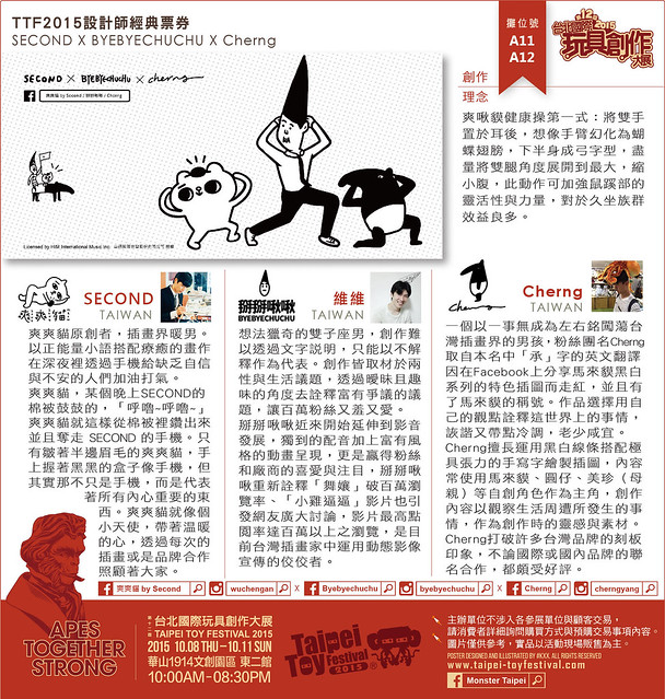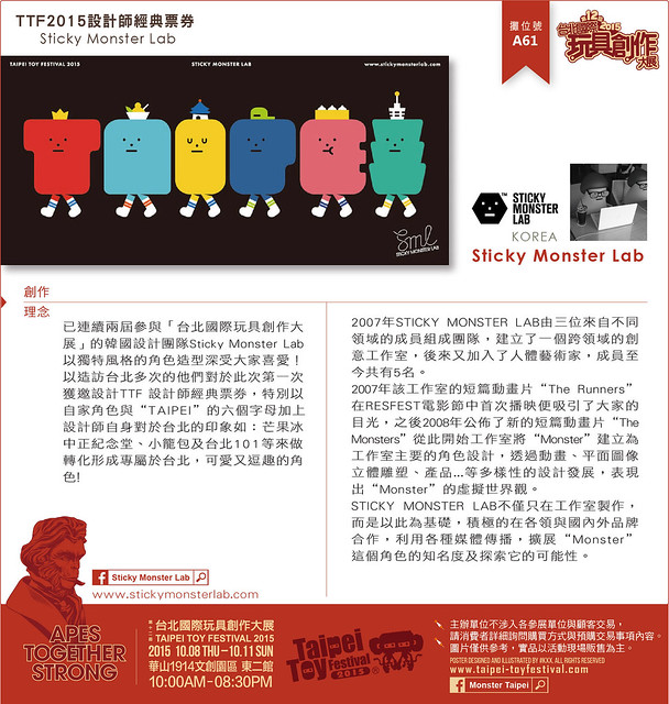 已連續兩屆參與「台北國際玩具創作大展」的韓國設計團隊Sticky Monster Lab以獨特風格的角色造型深受大家喜愛! 以造訪台北多次的他們對於此次第一次獲邀設計TTF設計師經典票券,特別以自家角色與 ‘TAIPEI’的六個字母加上設計師自身對於台北的印象如:芒果冰、中正紀念堂、小籠包、世界地標台北101等來做轉化形成專屬於台北,可愛又逗趣的角色!