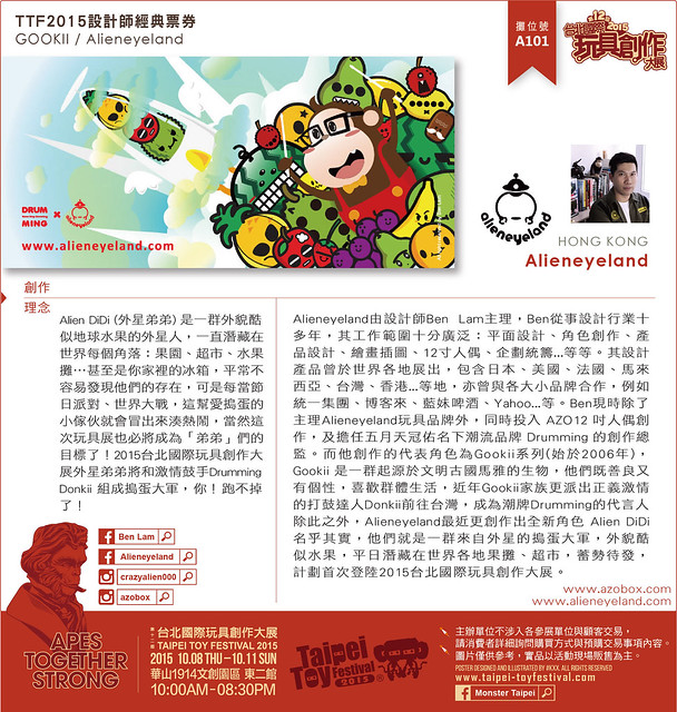 除此之外,Alieneyeland最近更創作出全新角色Alien DiDi,名乎其實,他們就是一群來自外星的搗蛋大軍,外貌酷似水果,平日潛藏在世界各地果攤、超市,蓄勢待發,計劃首次登陸2015台北國際玩具創作大展。