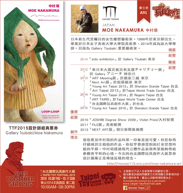 當您看見中村萌的作品時第一印象是很可愛。但是如果你再仔細端詳注視她的作品,你似乎會感受到如打坐冥想時般的平靜。中村萌透過現代立體作品表現希望能夠帶給參觀者平和的心境。金次的台北國際玩具作大展票券設計圖像正是傳達這樣的概念。