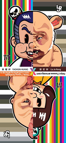 在票券的概念上跳脫了以往展覽邀請卡的視覺,用較醒目的卡通化表現,將色彩做較豐富的搭配來呈現視覺效果,而為了更能融合我倆的風格,我先將劉哲榮本次展出的立體作品(族‧相)重新描繪,並將我自己的(血與骨)系列主角,做出各半且上下對稱的視覺呈現,也藉此表達著人們在生活中所呈現的面貌與身分可能不只一個。而背景則是將我們作品所呈現的色感抽出並重新排列,來呈現出我與劉哲榮作品色感的氛圍。