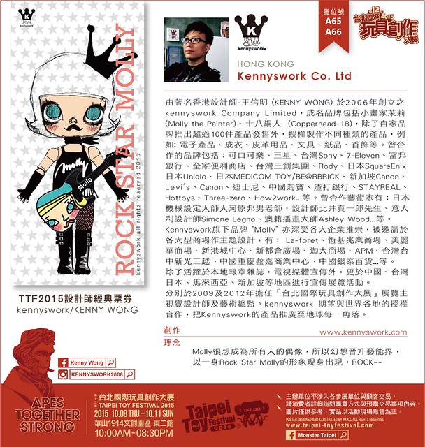 分別於2009及2012年擔任「台北國際玩具創作大展」展覽主視覺設計師及藝術總監。kennyswork 期望與世界各地的授權合作,把Kennyswork的產品推廣至地球每一角落。