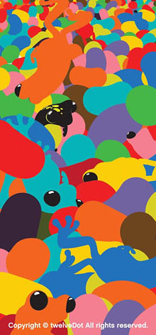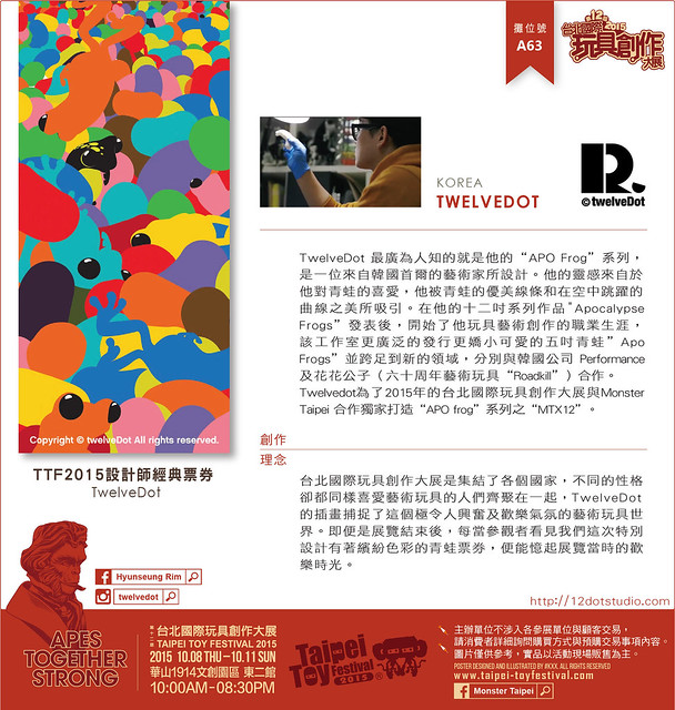 台北國際玩具創作大展是集結了各個國家,不同的性格卻都同樣喜愛藝術玩具的人們齊聚在一起,twelveDot的插畫捕捉了這個極令人興奮及歡樂氣氛的藝術玩具世界,即便是展覽結束後,每當參觀者看見我們這次特別設計有著繽紛色彩的青蛙票券,便能憶起展覽當時的歡樂時光。